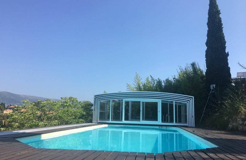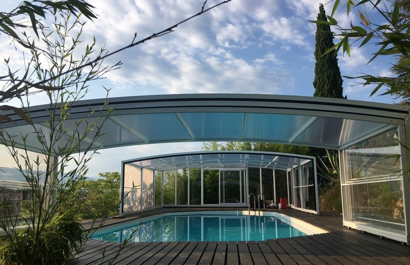 - Eine 100 % Teleskop-Poolüberdachung ohne störende Bodenführungsschienen, die der Ästhetik und den Komfort beeinträchtigen.